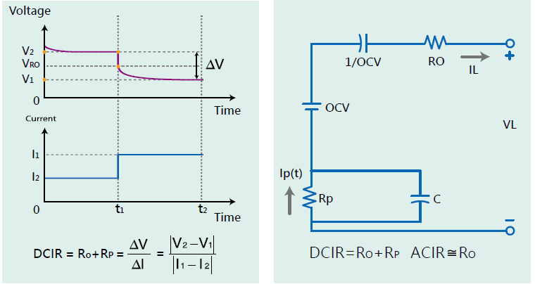 内电阻值的大小关系着动力电池可应用充/放电流大小,内阻越大效率越差且形成发热温升,ACR用来评估影响瞬间输出的传导性电阻,但无法评估包含电化学特性的输出电阻,DCIR的评估方式根据BS EN 61960的精神,采用二段加载电流测试,以电流变化造成的电压差来计算DCIR值,更贴近于电池连续电流应用的实际电阻效应,故动力电池或大功率能量型电池都应经过DCIR的特性评估。