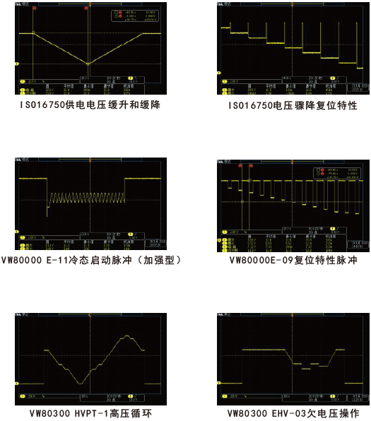 FTP032-C系列、FTG-C系列以及FTB9000-C系列电源可实现ISO16750-2(道路车辆电气电子设备的环境条件和试验第2部分:电气负荷)、LV124、LV148、SAEJ1113-11、ISO21848以及大众VW80000电气、电子设备测试波形功能。