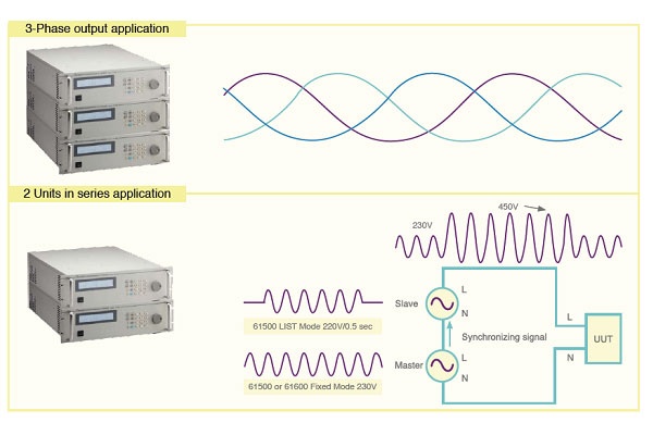 Chroma61503可编程交流电源可以使用三台, 在三相模式的同步机制下, 串联成三相电输出使用. 或使用两台做高压(300V-600V)输出应用, 搭配LIST模式可进行瞬间高压450V/0.5秒的测试, 如图.