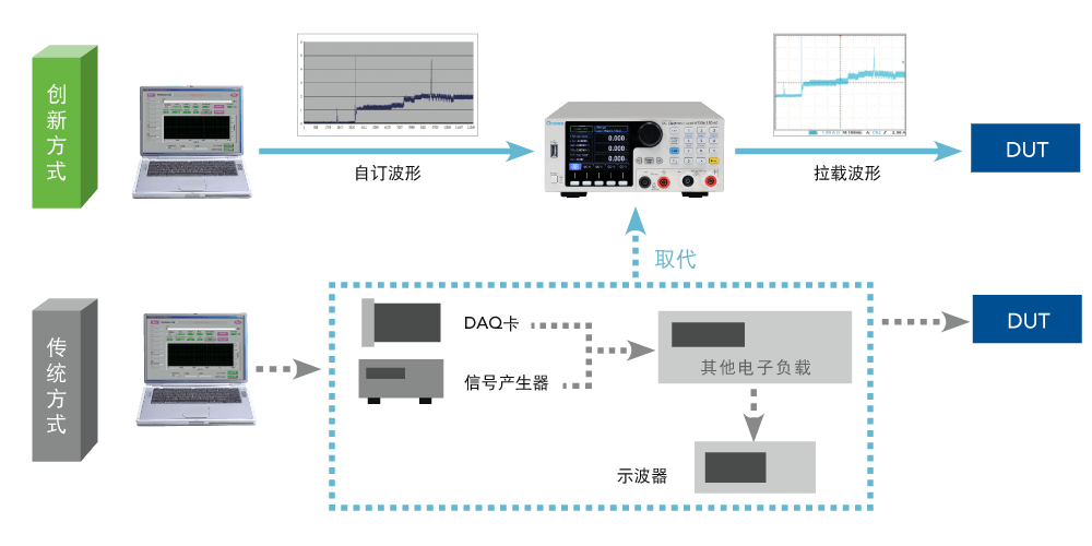 传统拉载任意电流波形的方式需要通过DAQ卡或任意波形产生器将电流波形送给电子负载进行拉载;创新的用户自订波形方式是将电流波形存储内部建的快闪记忆体(Flash),可储存10组电流波形,最高可达150万个波形点数,拉载实际电流的同时,亦提供拉载过程中所发生的最大电压电压的正负值,大大节省了使用示波器确认电压峰值的 时间。