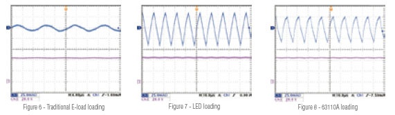 LED电源驱动器的输出涟波电流可以透过调整63110A内部电阻 (Rr) 来模拟。传统电子负载无法仿真LED driver的输出涟波电流,如图6所示。图7为LED当负载时的涟波电流。图8为63110A当负载时的涟波电流。