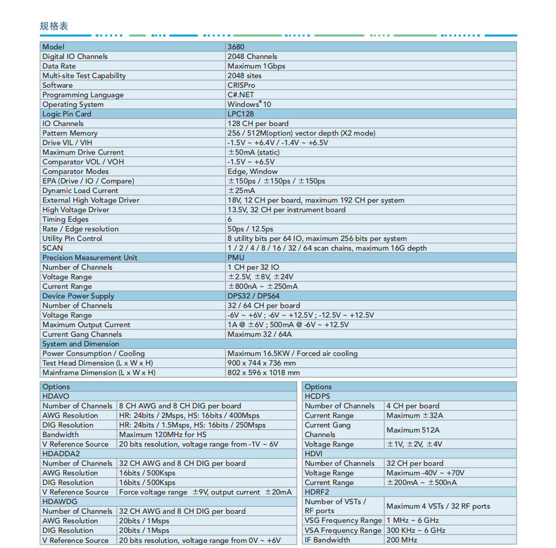 3680测试系统可灵活地在24个通用插槽内部署多达2048数字通道管脚的数字信号,其数字性能高达1Gbps,最大的默认256MW向量内存,可在高速应用中提供出色的定时精准度±150ps EPA,并提供多种测试板选择。